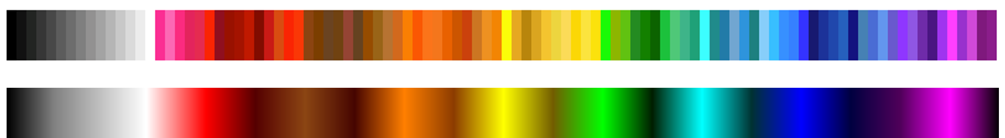 Here is a picture of integer color numbers, but remember that color numbers are continuous. (As usual, “continuous” values are ultimately converted to integer RGB values, so there’s really some granularity.) Color numbers 0-14 are continuously varying grayscale, from 0=black to 14=white. Color numbers 14+ε to 20 are linearly varying shades of pink, with RGB Red at color number 20.